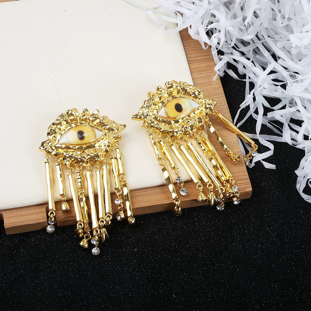 Crafted in a shimmering gold-tone finish. Featuring a mystical eye motif at the center, each earring is adorned with cascading metal tassels and delicate rhinestone accents for a touch of sparkle and drama.