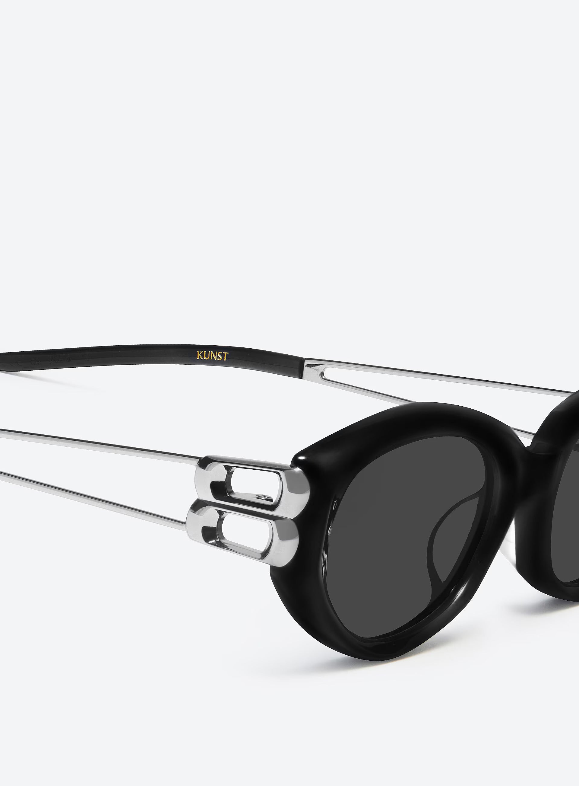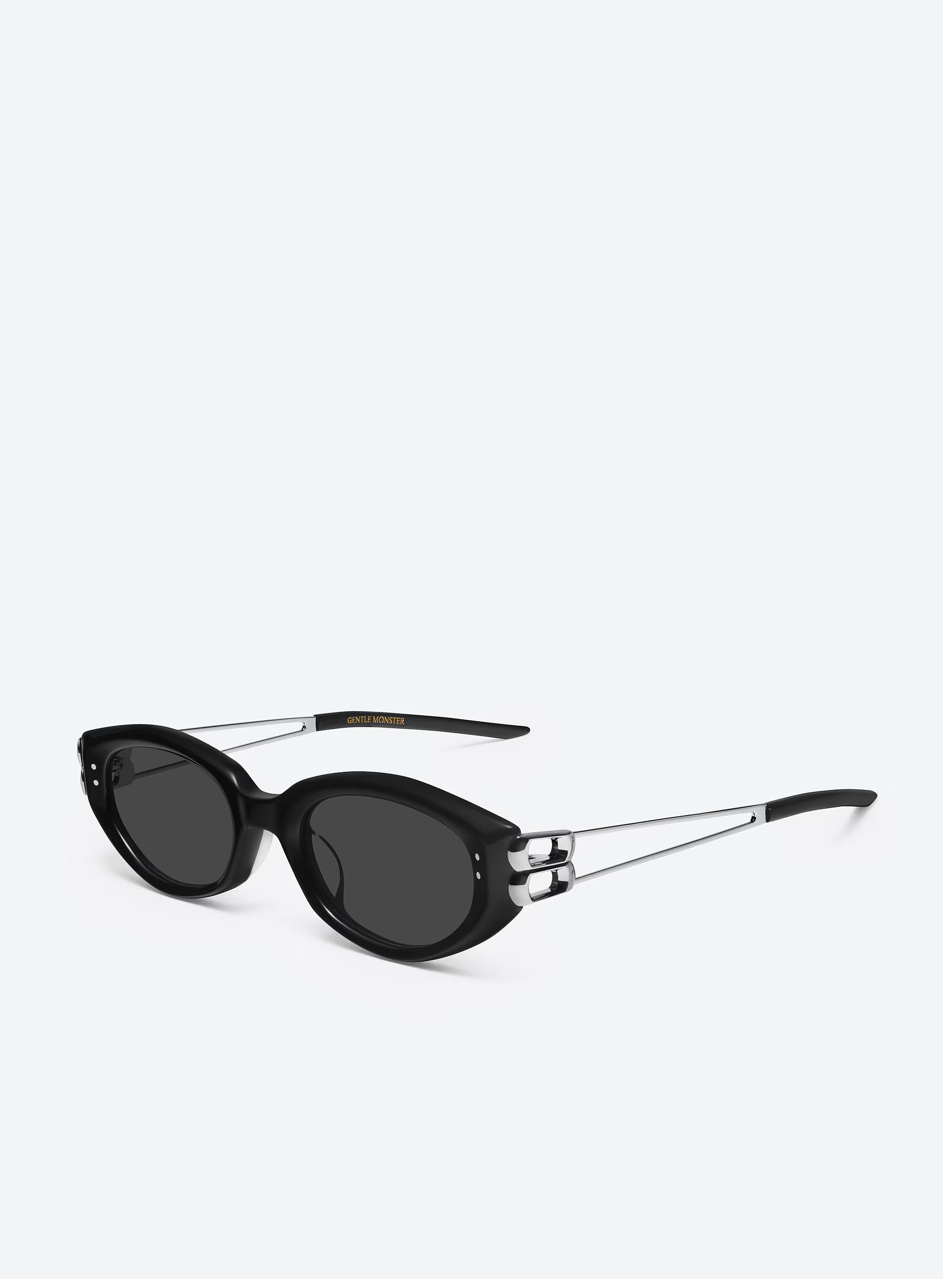 Gentle Monster's 2025 Collection. This piece features sophisticated cat-eye sunglasses in black mixed materials.